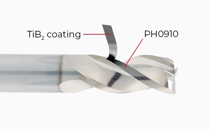 O novo revestimento PHT, uma solução à base de TiB₂, foi especificamente concebido para a maquinação de alto desempenho de materiais não ferrosos, como o alumínio, onde os revestimentos convencionais falham frequentemente devido à adesão do material e à formação de arestas postiças (built-up edge - BUE). Graças à sua composição química única, o PHT não apresenta praticamente nenhuma afinidade com o alumínio e outros metais macios, eliminando eficazmente a aderência do material e reduzindo o desgaste da ferramenta.